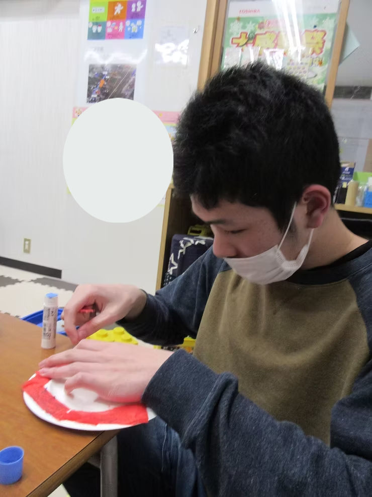 節分で鬼のお面作りをしました。紙皿にお花紙をちぎって貼り、目・鼻・口・角・歯などの顔のパーツを貼りました。カラフルで色々な表情の鬼ができました。